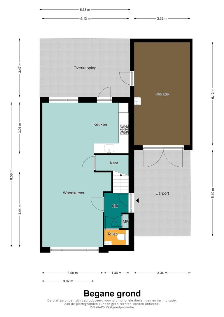 Via de oprit met carport bereikt u de in de zijgevel gelegen entree. Hier bevindt zich de ontvangsthal met meterkast en de moderne toiletruimte  met hangend toilet en fonteintje. Vanuit de hal komt u in de aan de voorzijde gelegen woonkamer met grote raampartij die zorgt voor veel daglicht. De woonkamer loopt aan de achterzijde door naar de open keuken met moderne witte hoogglans hoekopgestelde keuken. Deze keuken is voorzien van 5-pits gaskookplaat, afzuigkap, vaatwasser, koelkast en een combi oven/magnetron. De in de woonkamer aanwezige trapkast zorgt voor extra berg-provisieruimte.