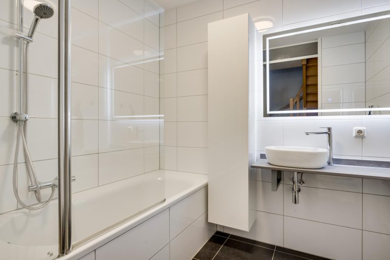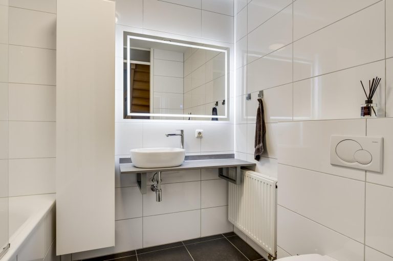 De moderne in neutrale kleuren afgewerkte badkamer is geheel betegeld en voorzien van ligbad met douchescherm, een badkamermeubel met verwarmde spiegel en hangend toilet.