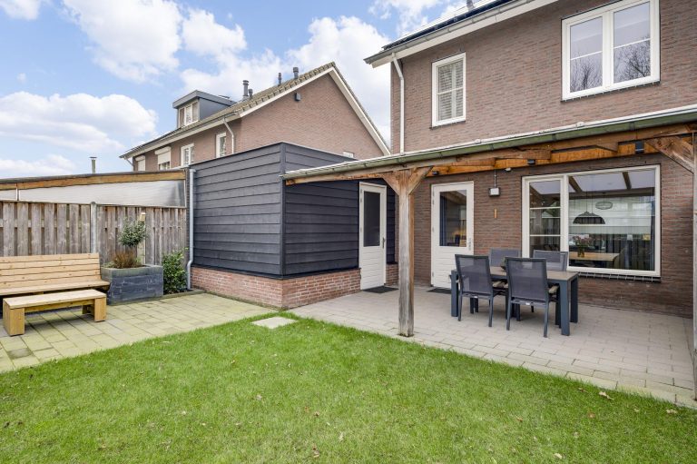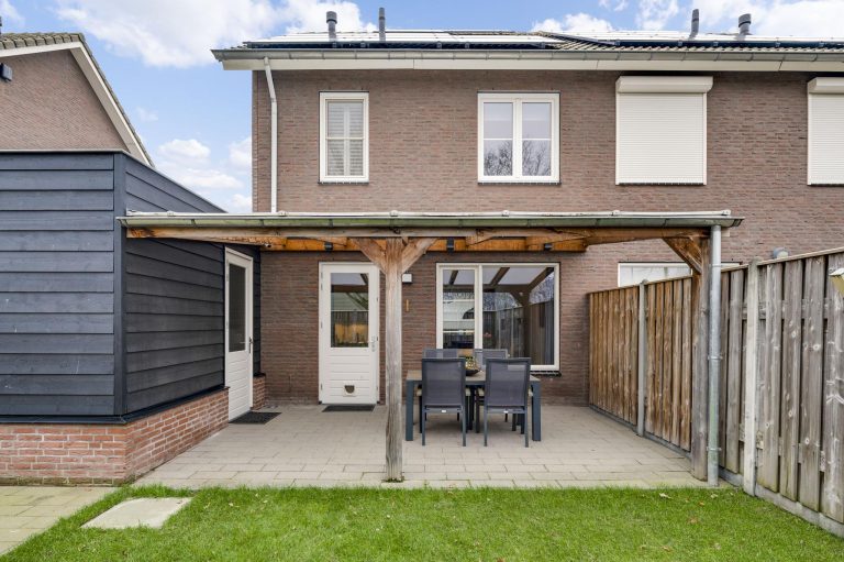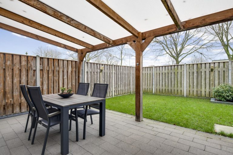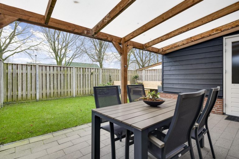 Vanuit de keuken is de op het zuiden gelegen, privacybiedende achtertuin bereikbaar. Deze is netjes aangelegd, voorzien van gras en een terras met loungehoek. De mooie aansluitend aan de woning gelegen overkapping met terras zorgt dat u heerlijk kunt genieten van de eerste zonnestralen. Deze ‘Douglas’-houten tuinoverkapping is voorzien van kunststof dakplaten, waardoor er voldoende licht in de woning komt. Via de overkapping is de ruime (ca 6,1 bij 3,3m) garage/berging bereikbaar. U kunt dus altijd ‘droog’ naar de garage.