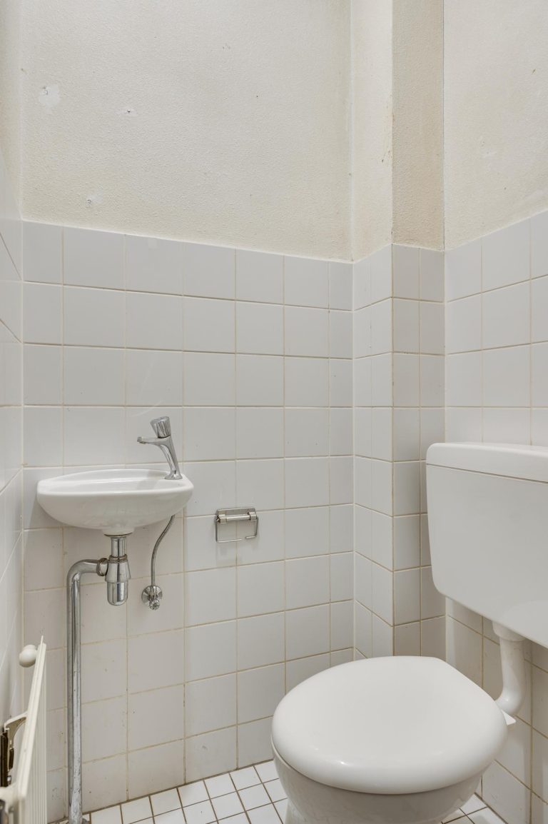 Ontvangsthal met meterkast, toegang kruipruimte en gedeeltelijk betegelde toiletruimte met staand toilet en fonteintje.