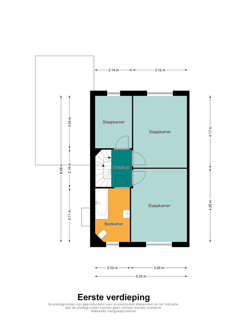 Twee slaapkamers, groot ca 6,5 en 13m2, zijn gelegen aan de achterzijde van de woning. De ouderslaapkamer (groot ca 4,25 bij 3,20m) is gelegen aan de voorzijde. De eenvoudige, geheel betegelde badkamer is voorzien van ligbad met douchescherm, toilet en wastafel.
