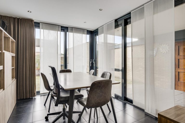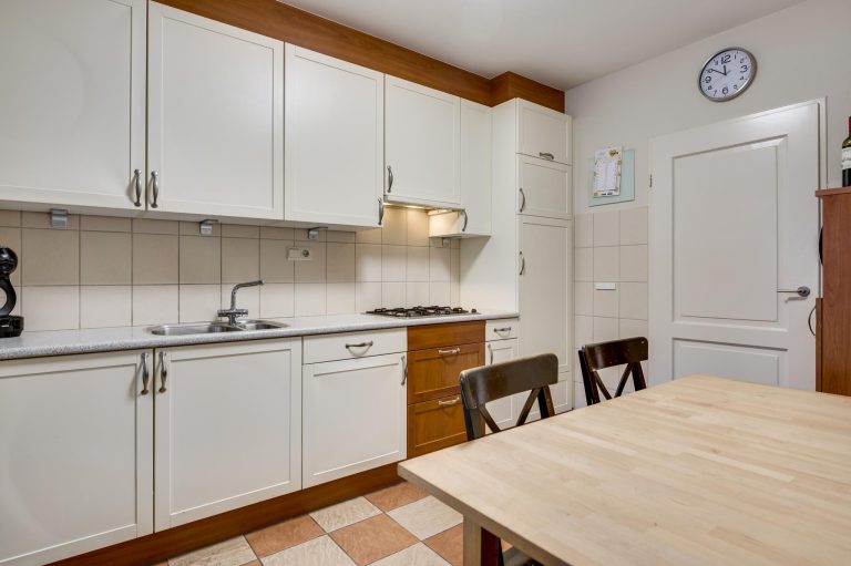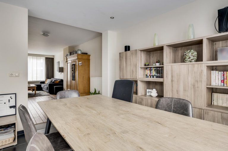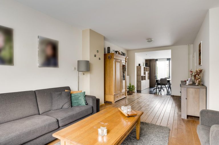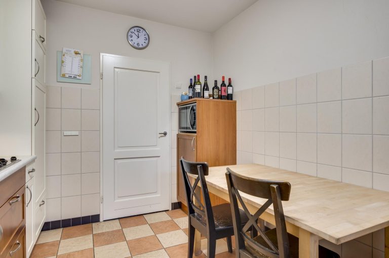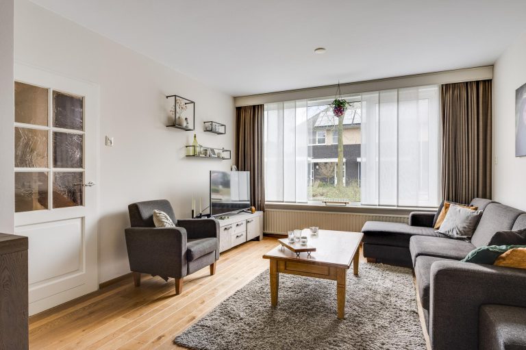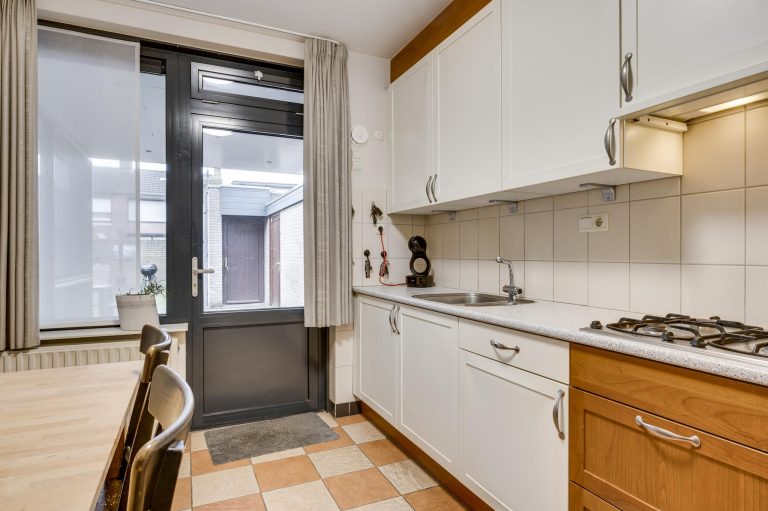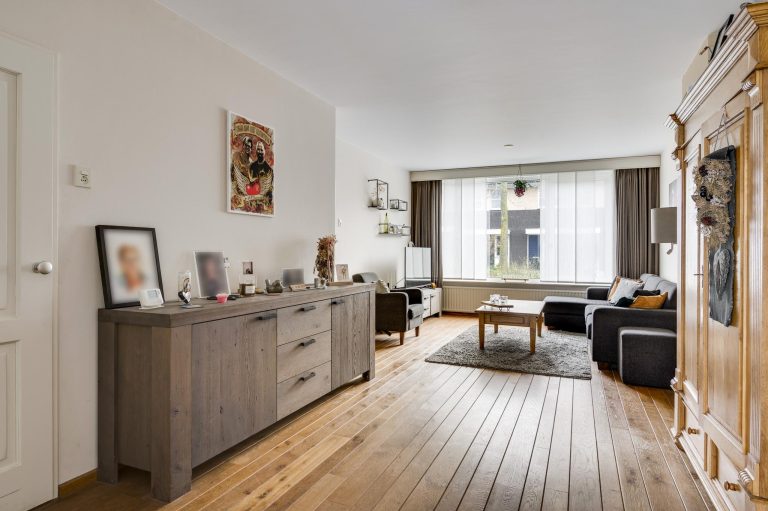 De royale woonkamer met houten vloer heeft aan de voorzijde een grote raampartij wat zorgt voor veel lichtinval. Aan de achterzijde is in 2011 een mooie tuinkamer aangebouwd voorzien van tegelvloer met vloerverwarming en grote raampartijen. De dichte keuken is voorzien van een keukenopstand in lichte kleurstelling met gaskookplaat, koelkast, afzuigkap en close-in-boiler.