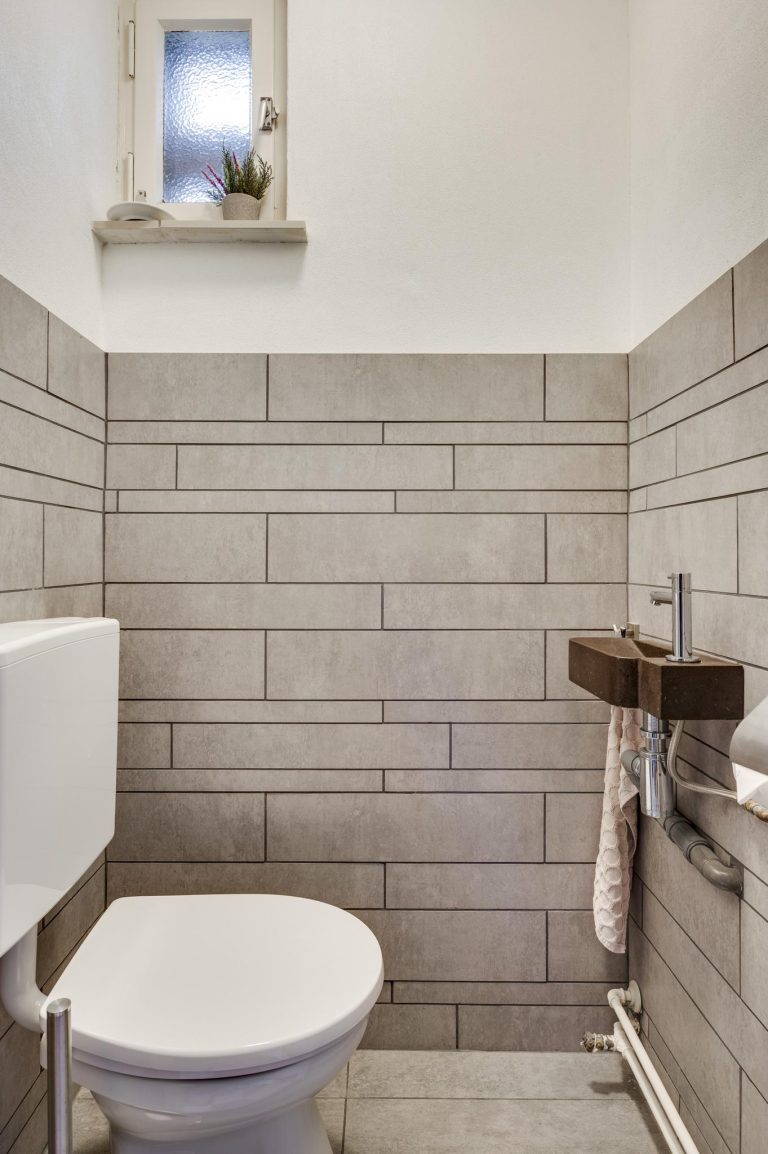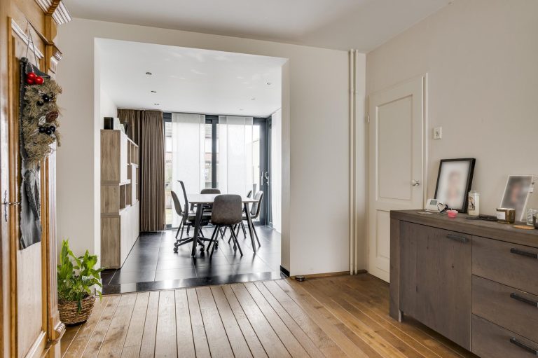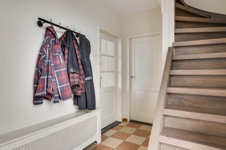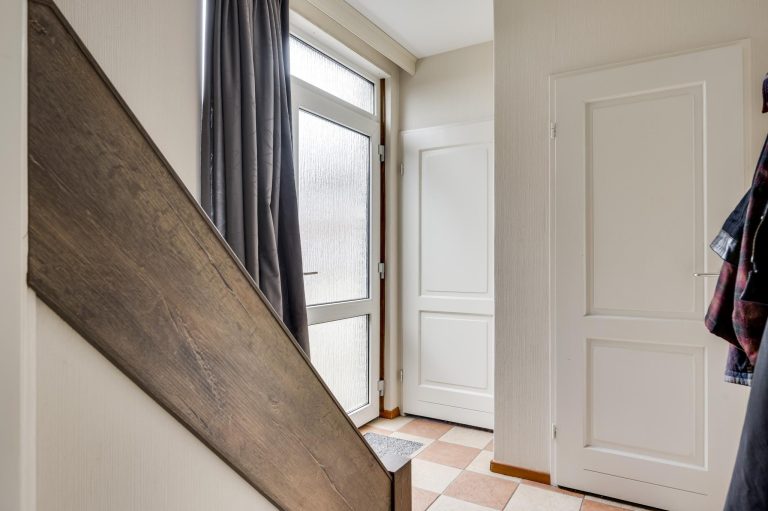Entree tot de woning gelegen in de zijgevel. Hal met vernieuwde meterkast, deels vernieuwde toiletruimte met staand toilet en fonteintje en trapkast met extra bergruimte.