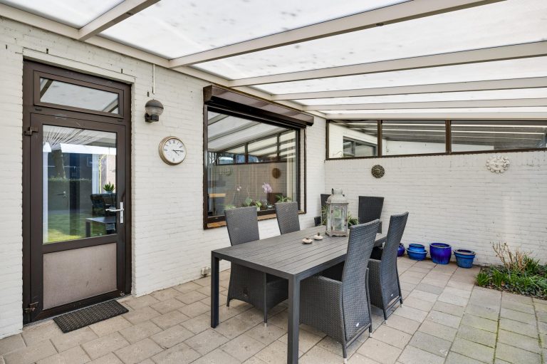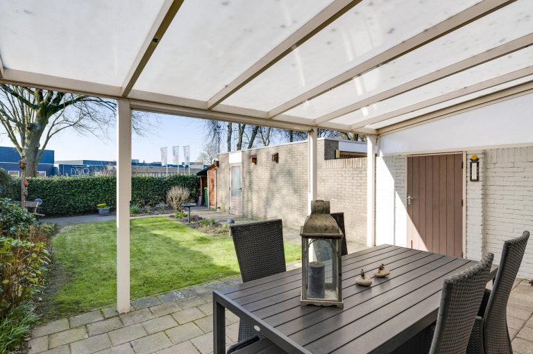 De achtertuin is vrij gelegen, heeft een betegeld terras met overkapping (ca. 6 bij 4m) en is verder aangelegd met borders en groot gazon. Extra zonwering aanwezig boven de overkapping. Vanuit de achtertuin toegang naar de garage en tuinberging.
