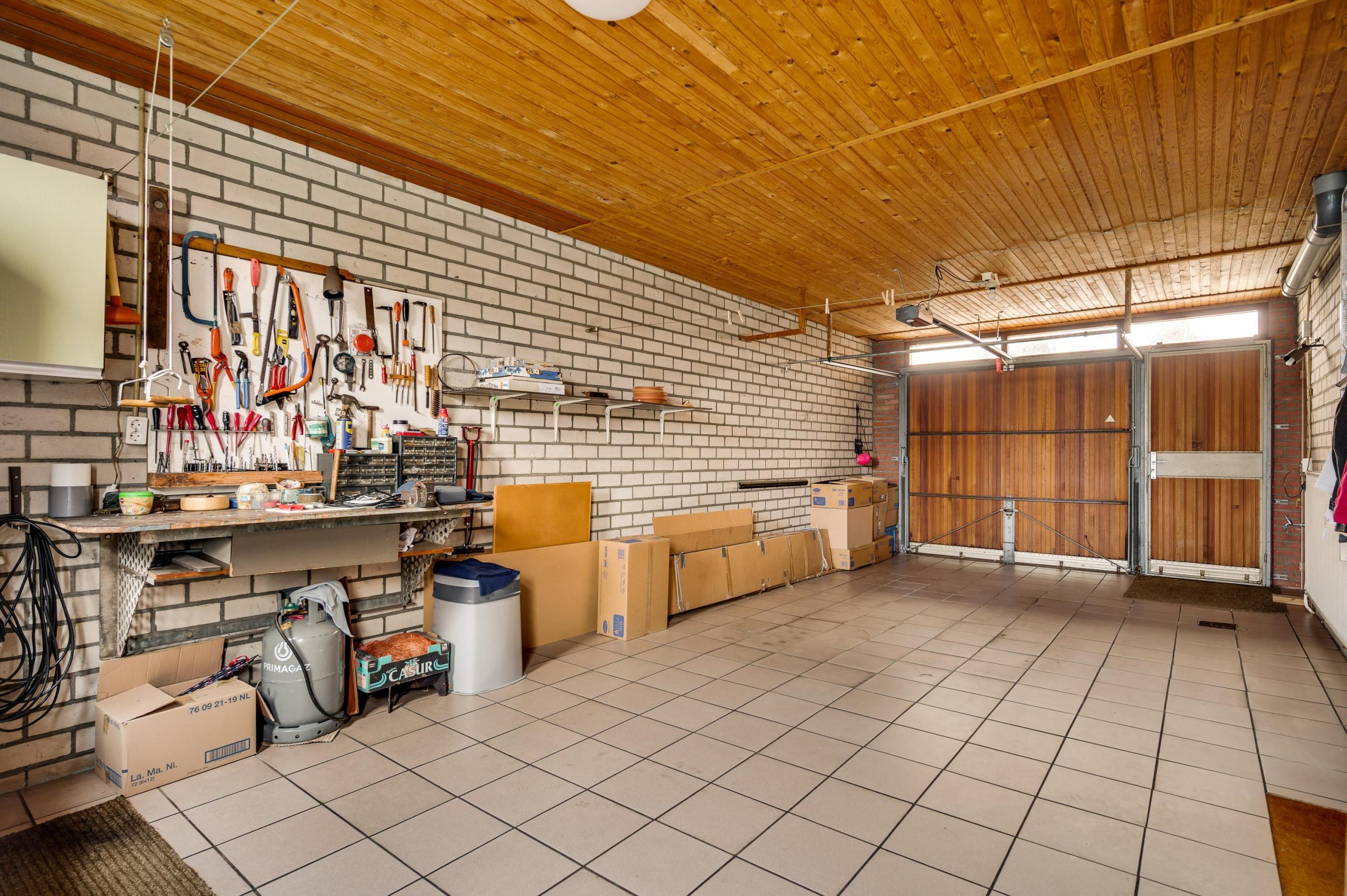 De woning heeft een eigen oprit en een ruime garage. De garage is voorzien van een elektrische kantelpoort en een aparte loopdeur. De garage biedt voldoende ruimte voor het parkeren van een auto en veel ruimte voor extra opslag. De garage beschikt verder over een keukenblokje met warm- en koud water en centrale verwarming. De ruimte is met een kleine ingreep makkelijk aan te passen naar kantoor of praktijk aan huis.