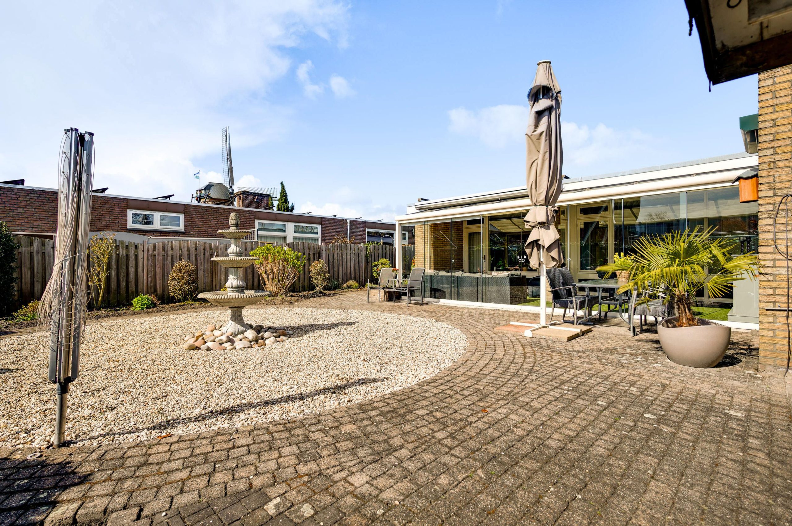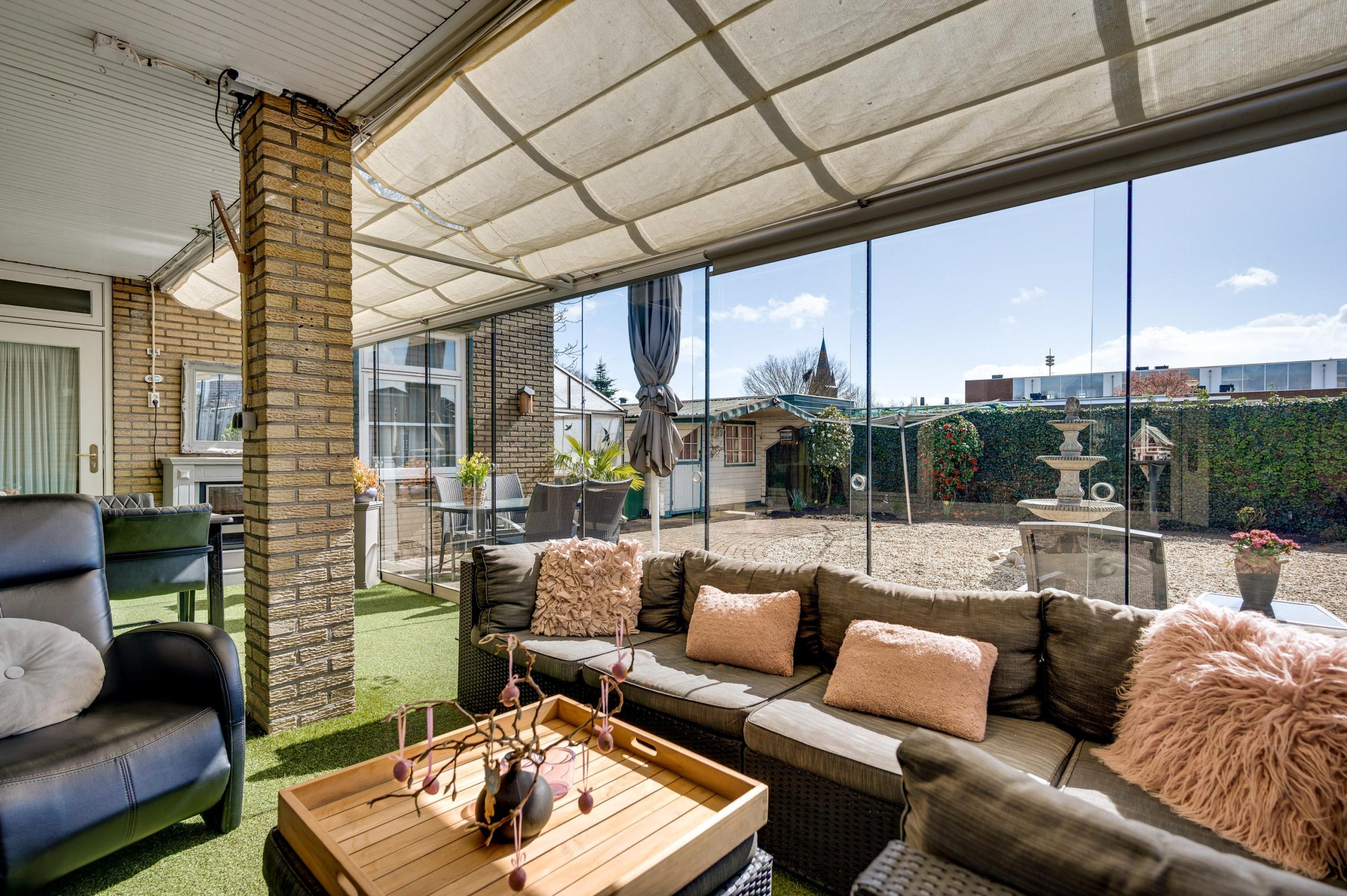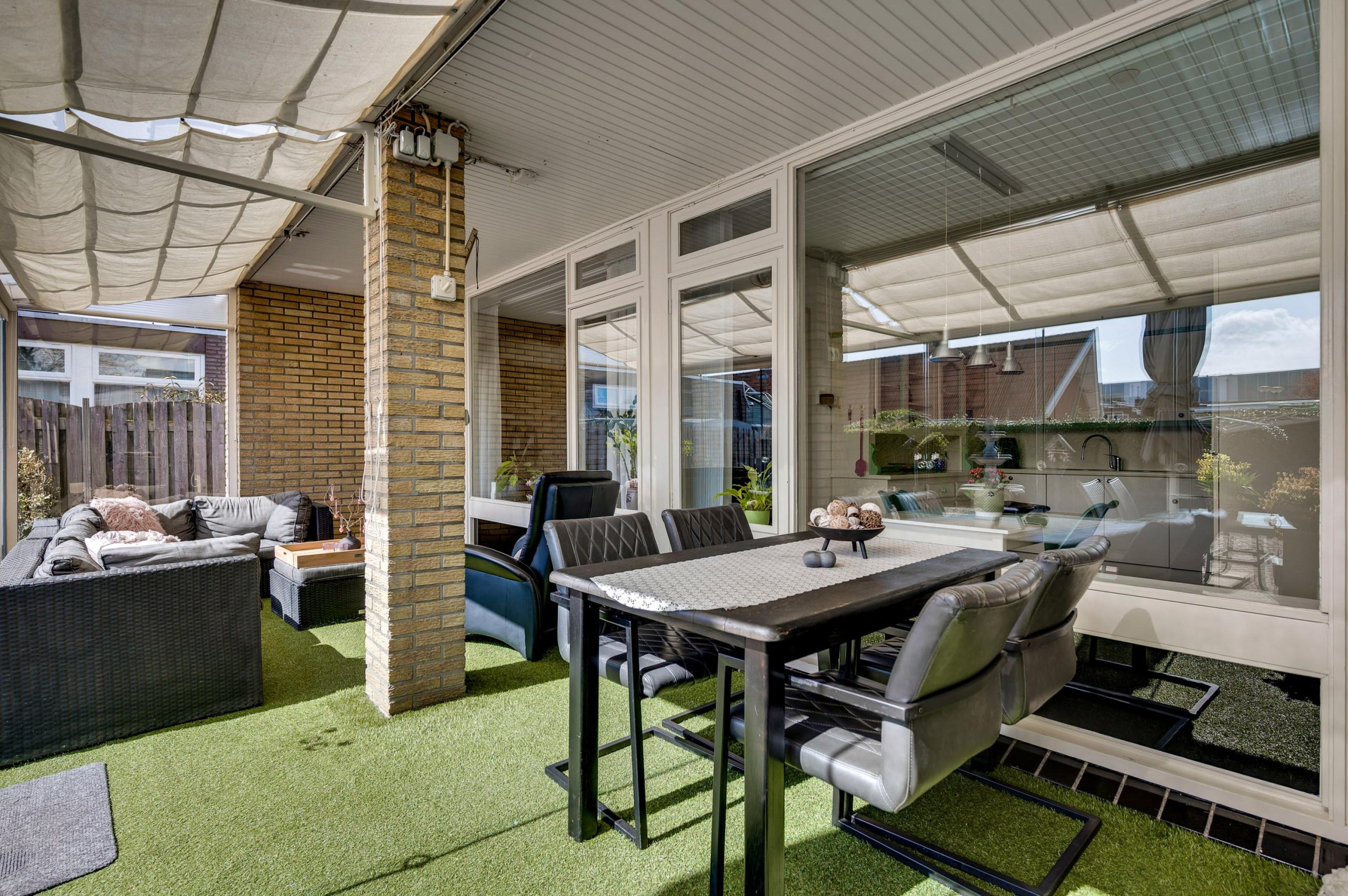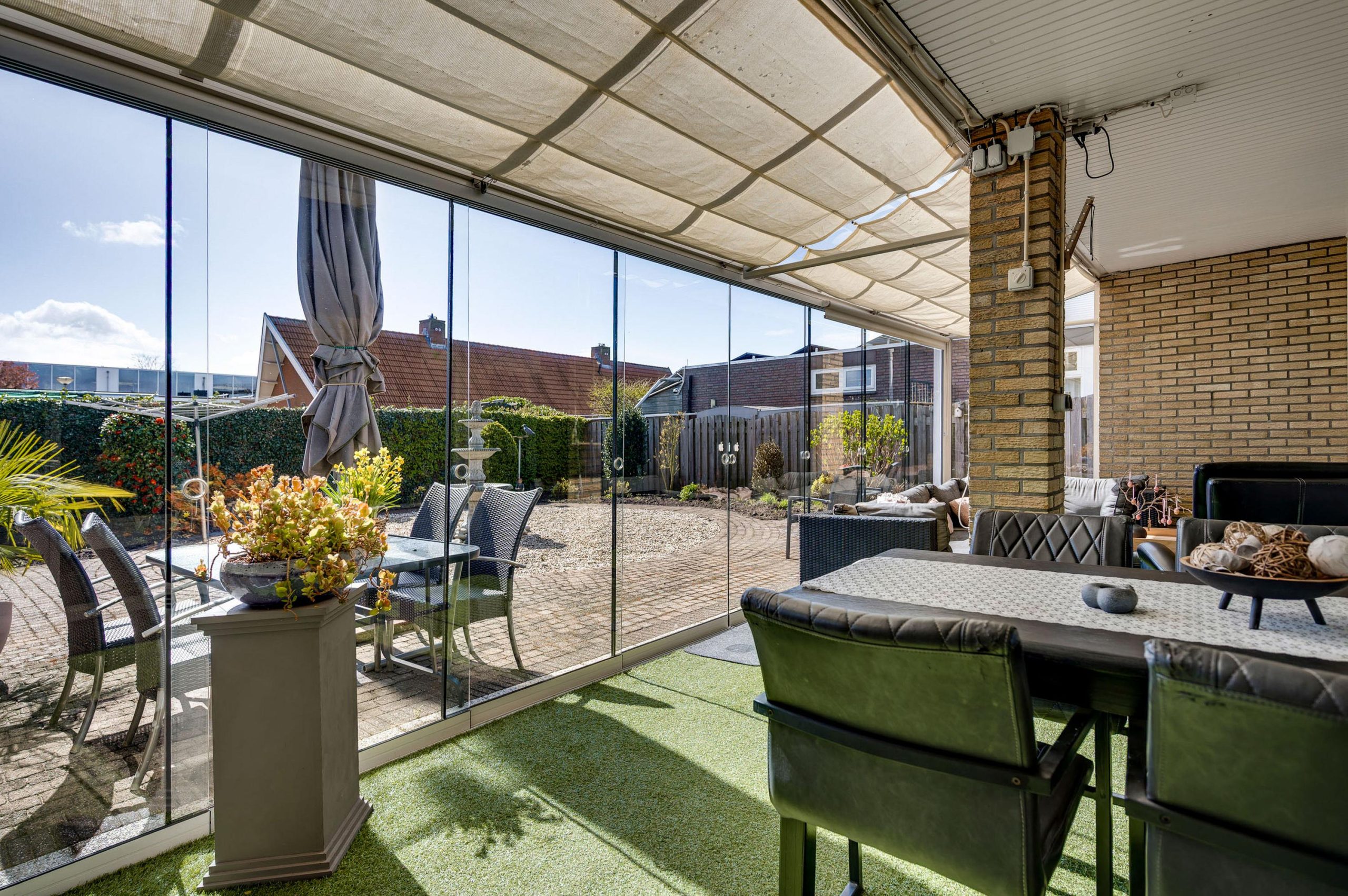 Aan de achterzijde van de woning bevindt zich een royale overkapping van ca. 22 m², voorzien van zonnescherm en een glazen schuifwand. Hierdoor ontstaat een extra comfortabele buitenruimte waar u al vroeg op de dag kunt genieten van de eerste ochtendzon en waar het vrijwel het hele jaar door aangenaam verblijven is.
