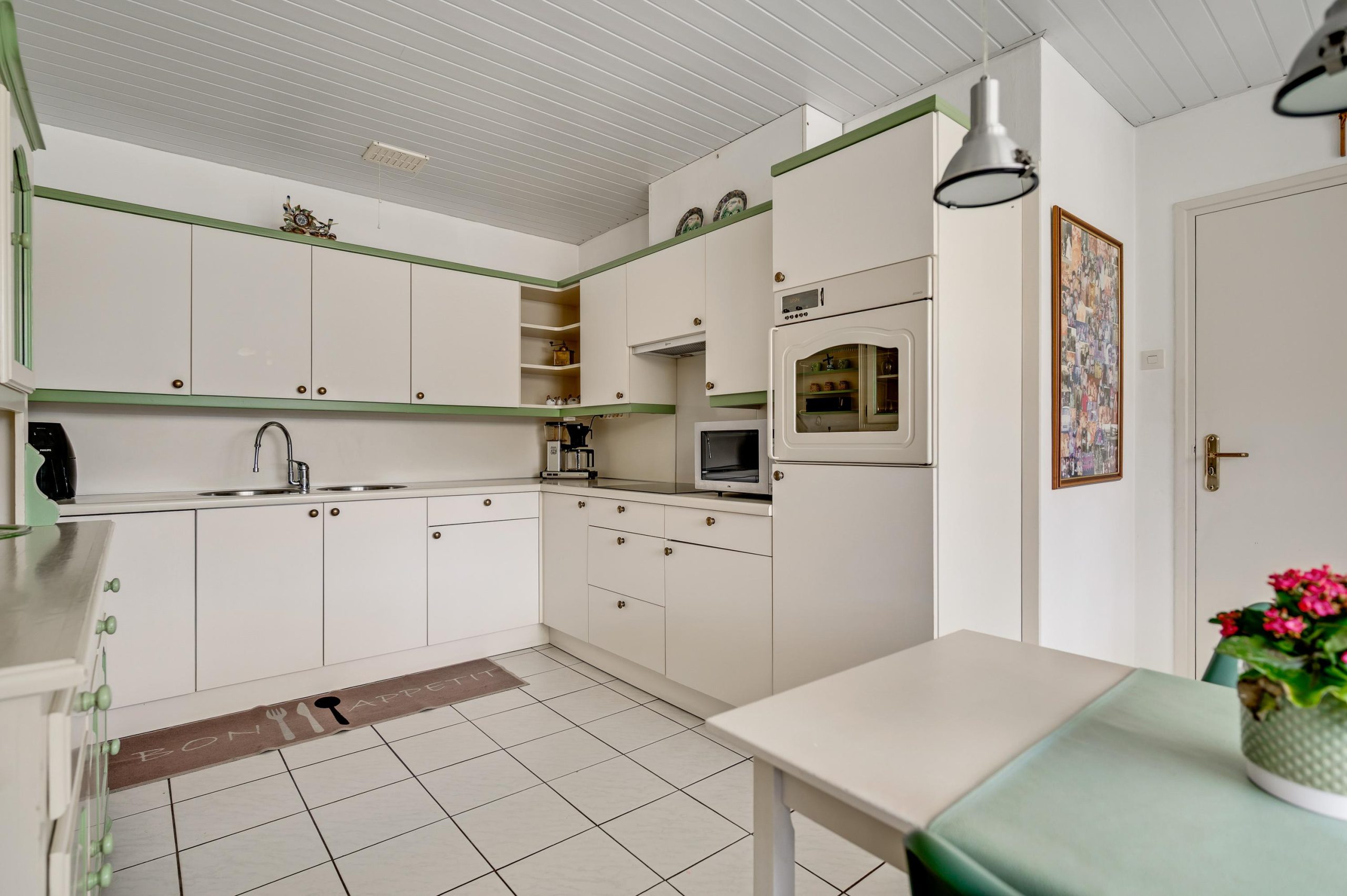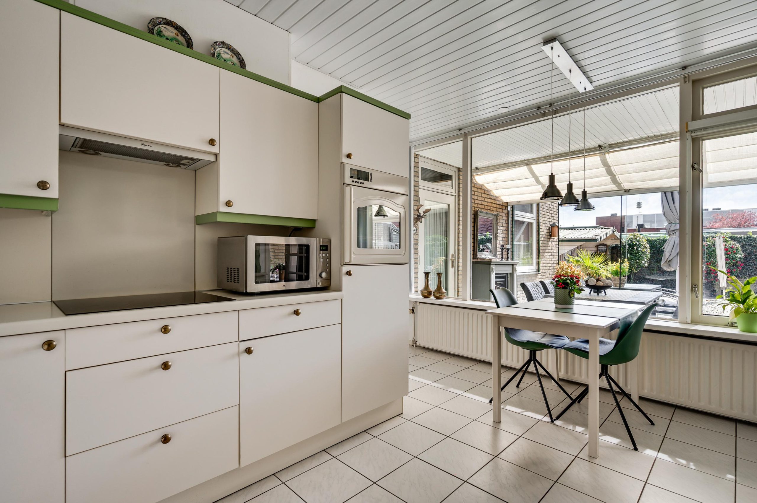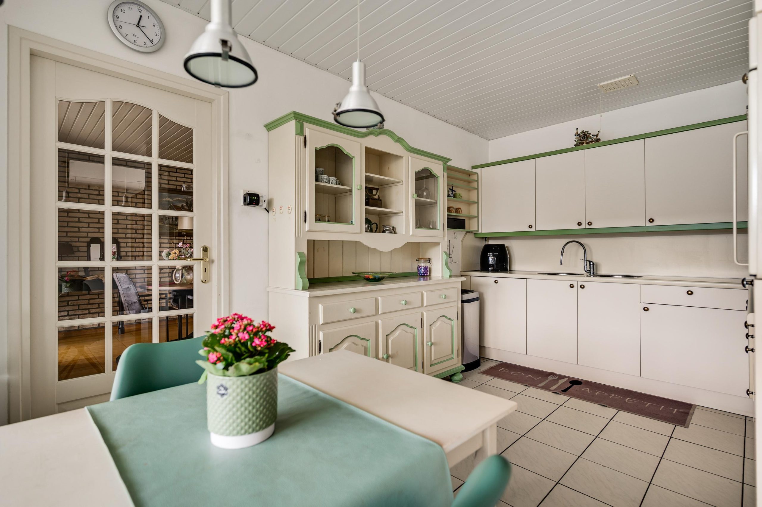 Aansluitend bevindt zich de gesloten keuken met een praktische hoekopgestelde keukenopstelling voorzien van inductiekookplaat, afzuigkap, vaatwasser, koelkast en oven.