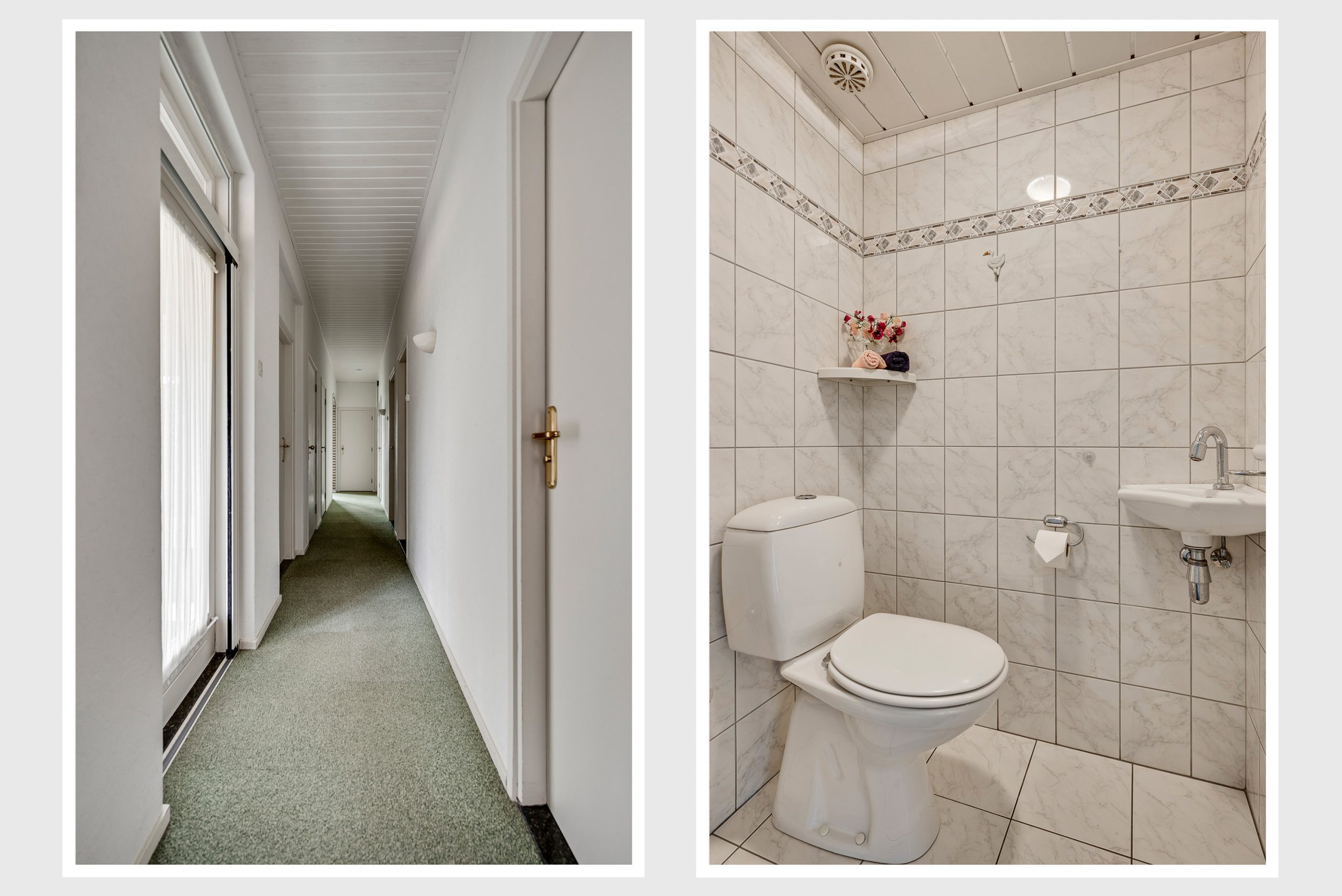 Vanuit zowel de ontvangsthal als via de keuken bereikt u de gang, die toegang biedt tot de overige vertrekken. Hier bevinden zich: