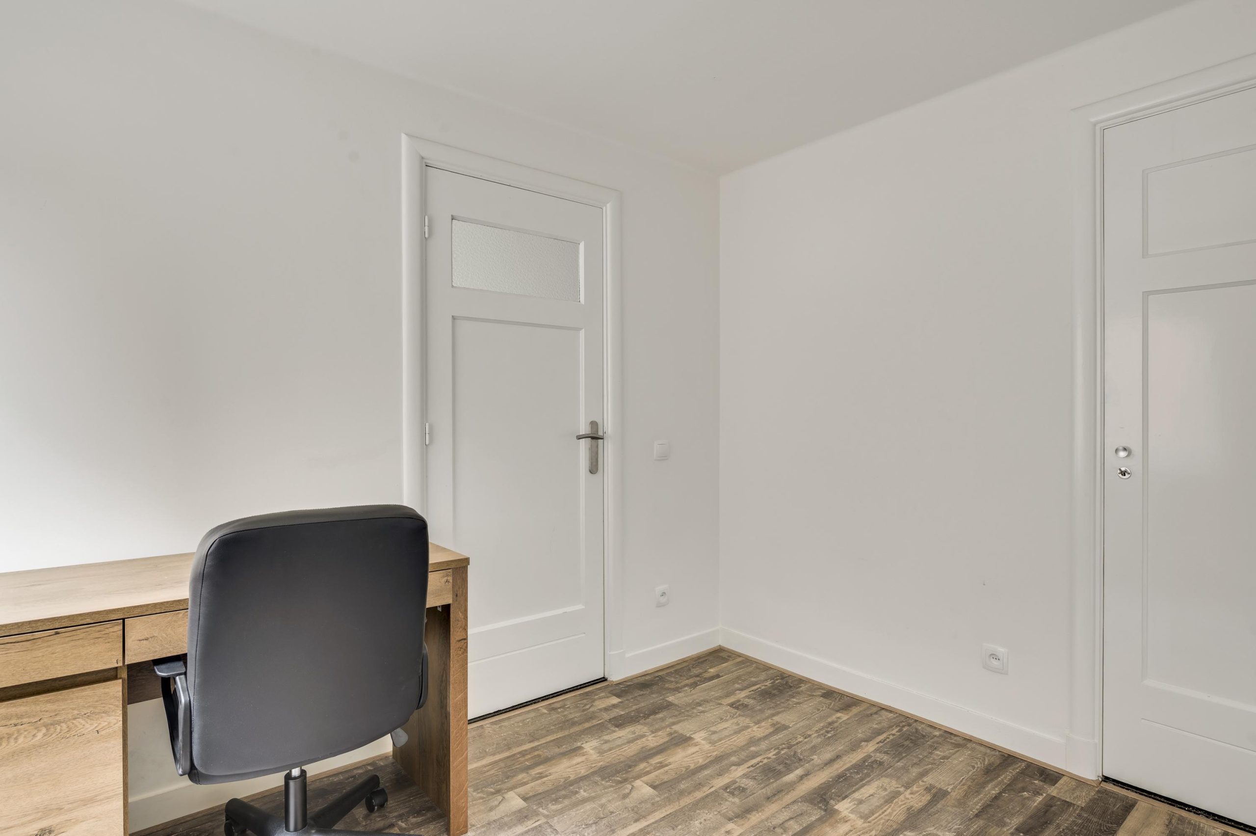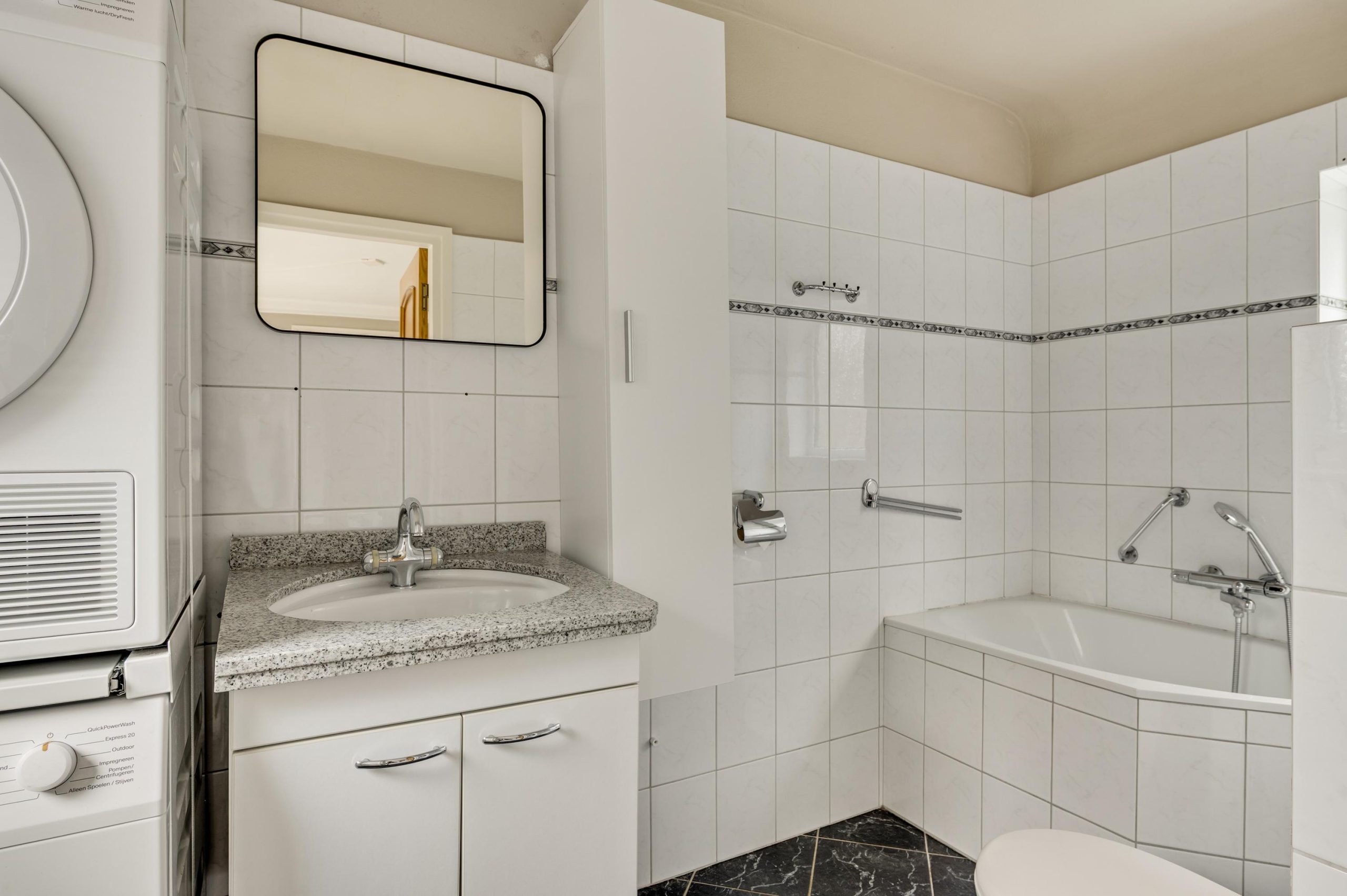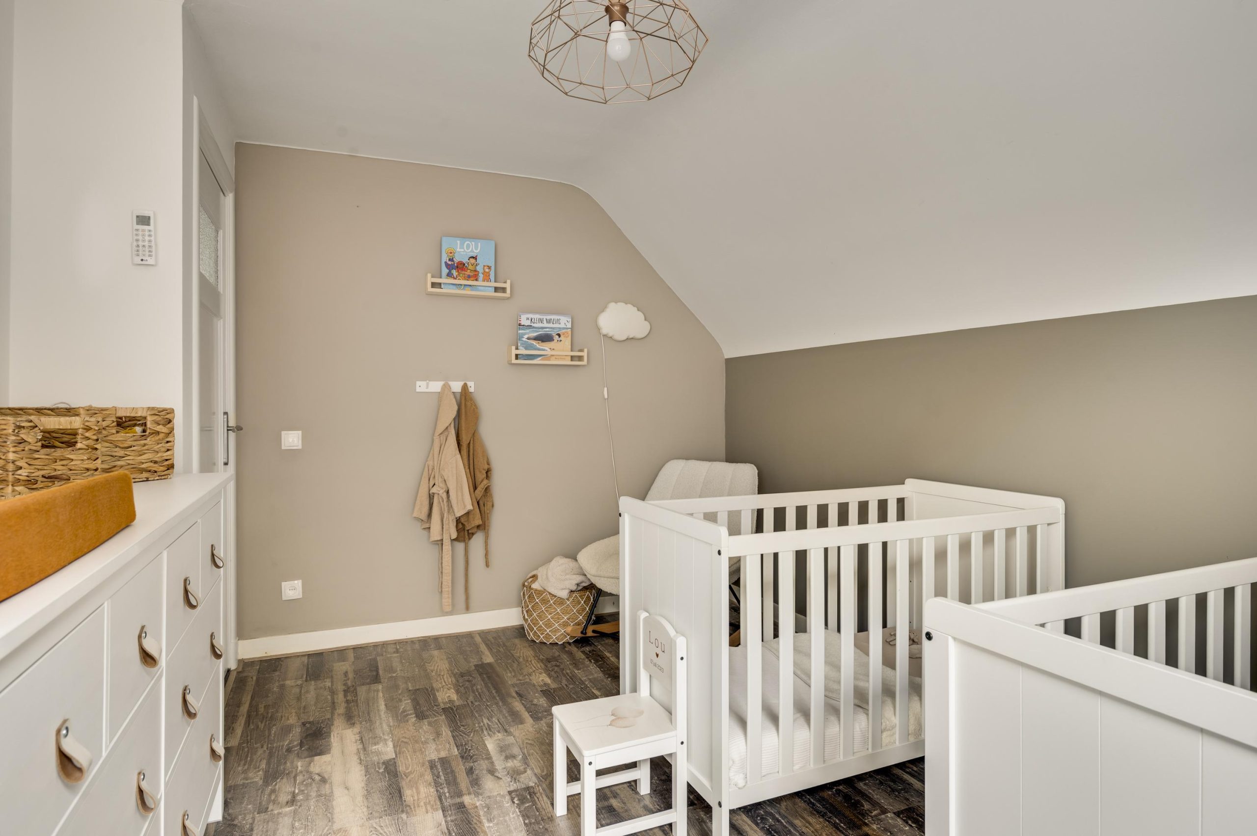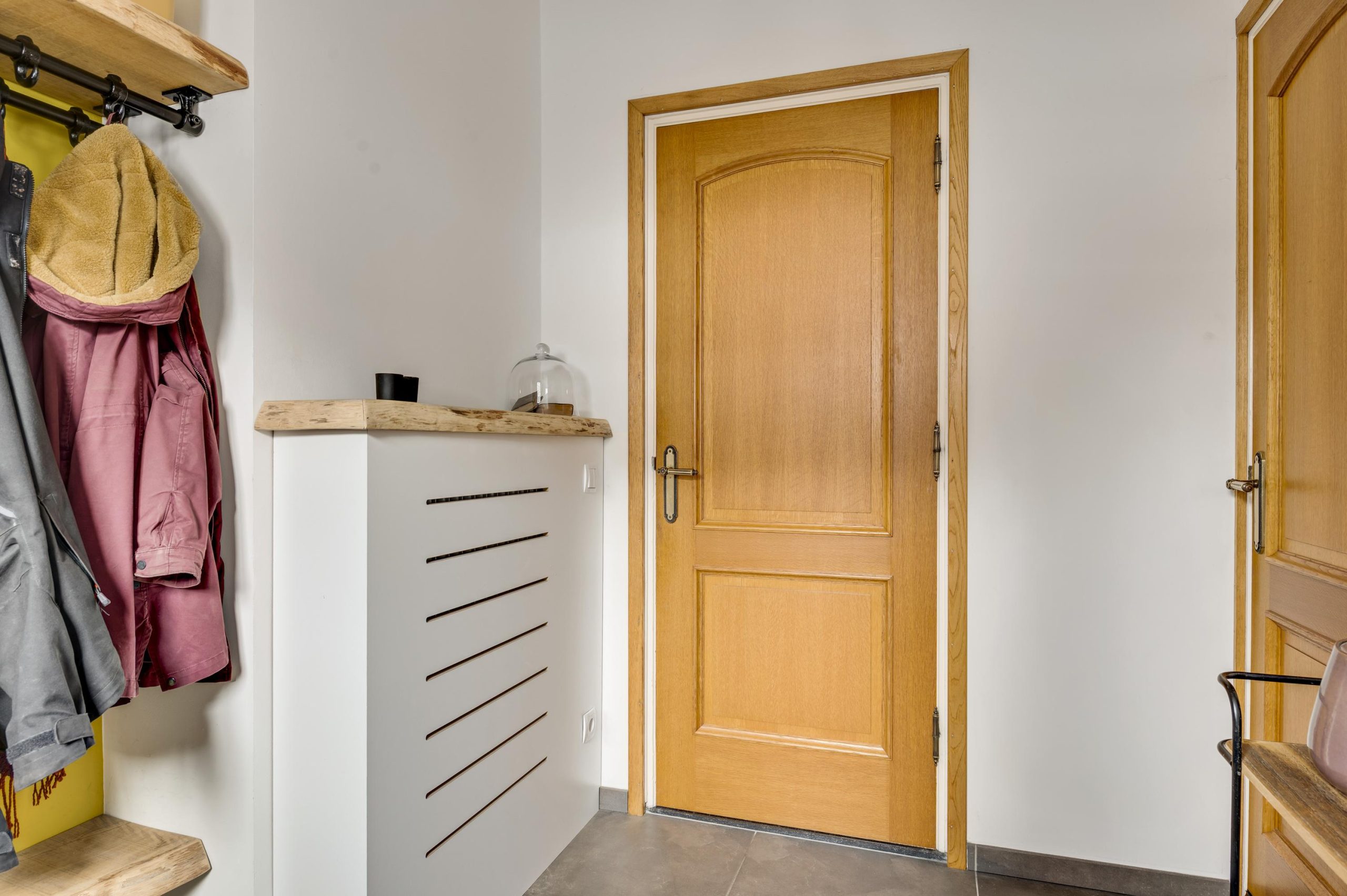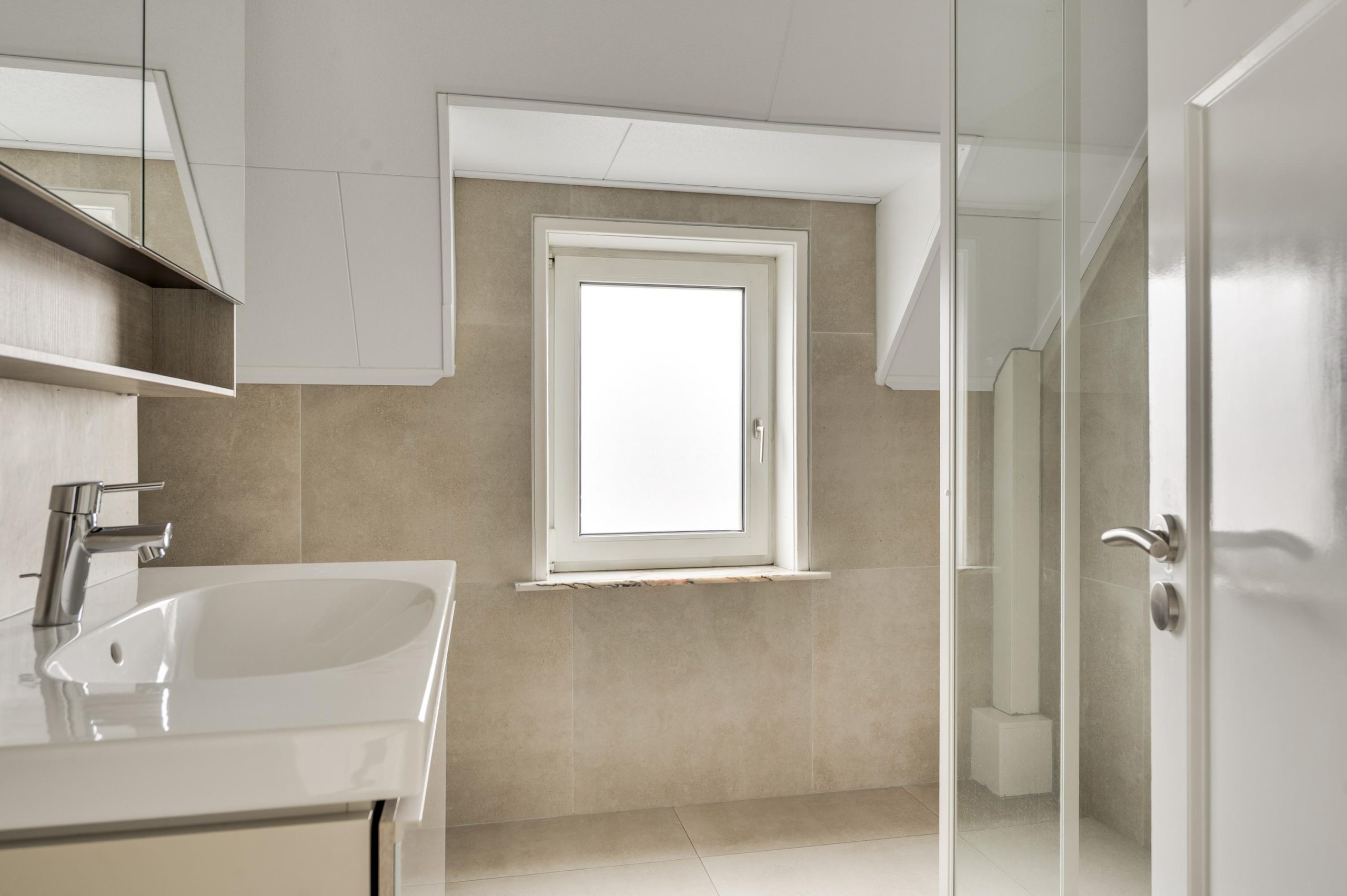 Overloop met toegang tot drie slaapkamers, alle voorzien van praktische muurkasten. Daarnaast bevindt zich hier de volledig vernieuwde badkamer (2026), modern uitgevoerd met een inloopdouche, wastafel met meubel, toilet en comfortabele elektrische vloerverwarming.