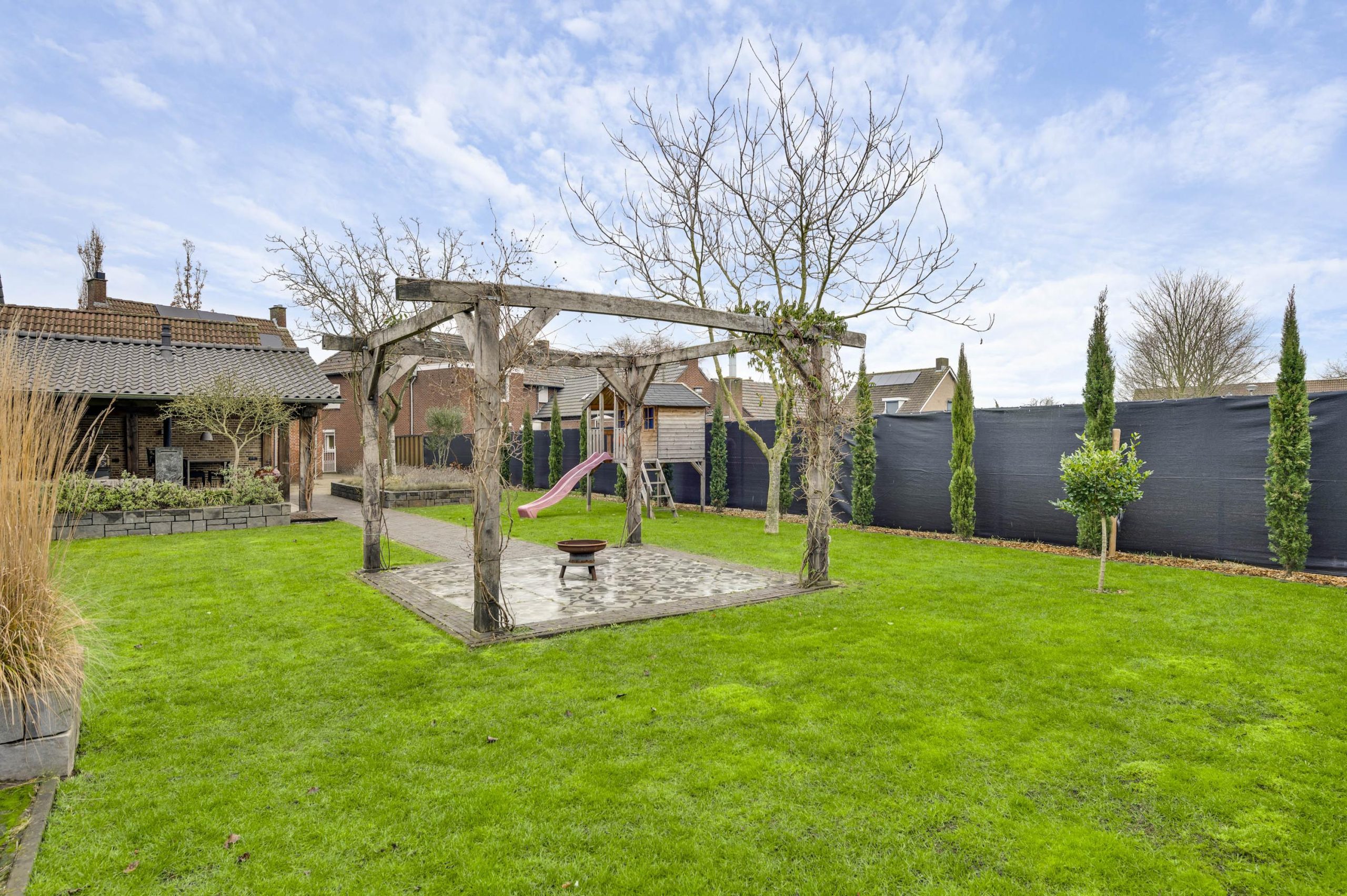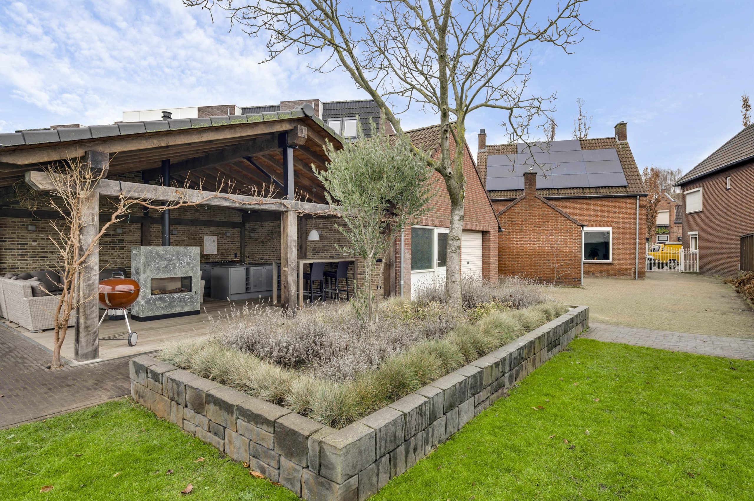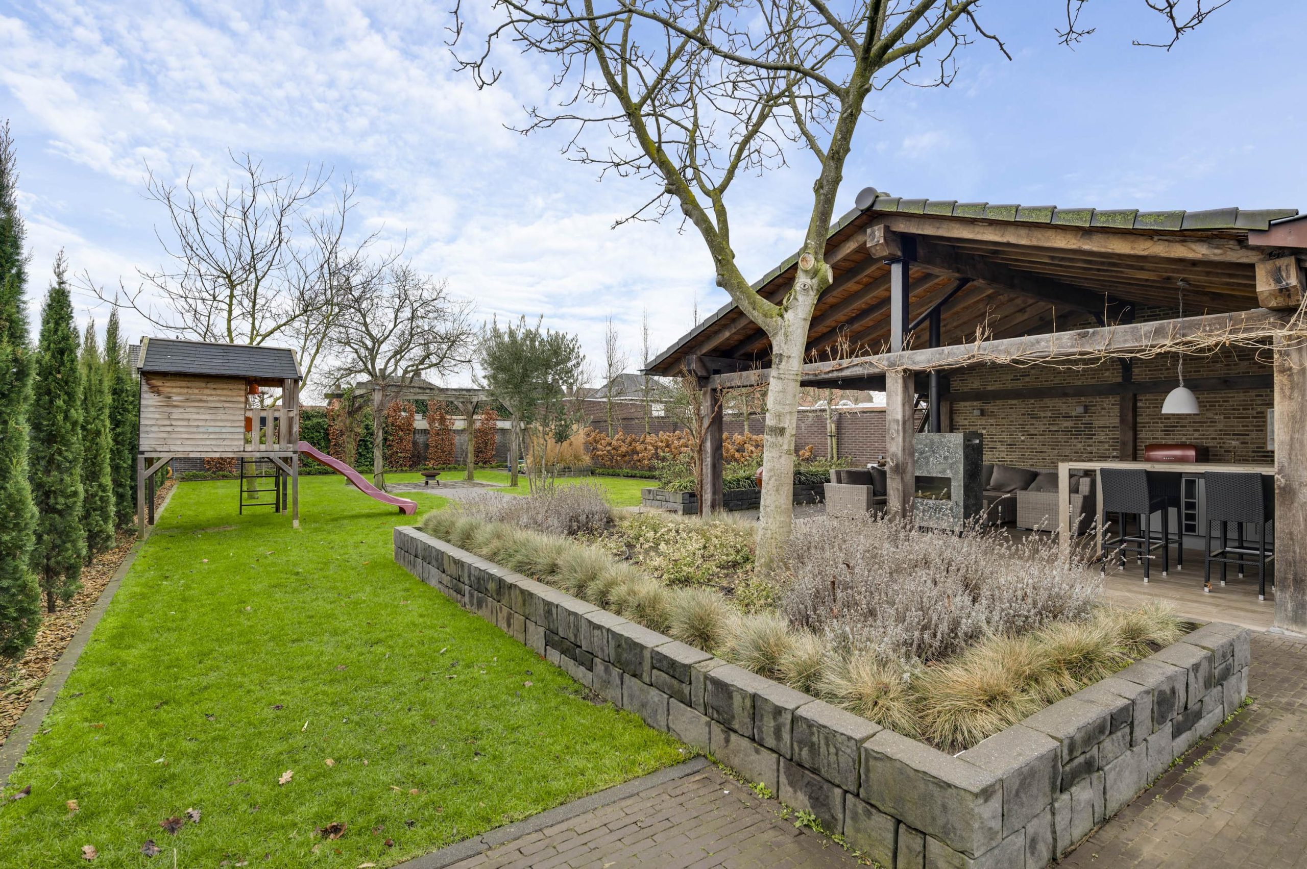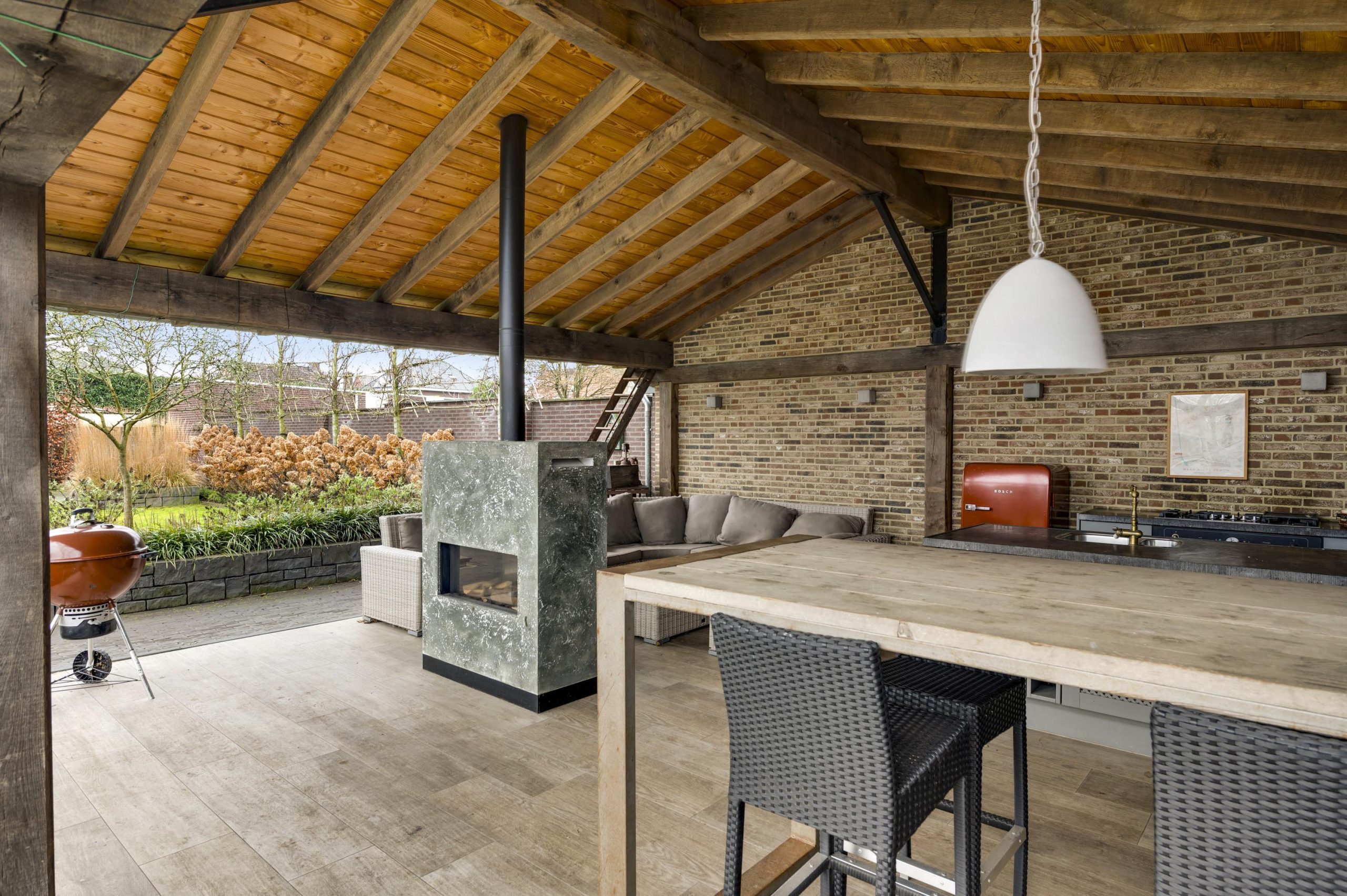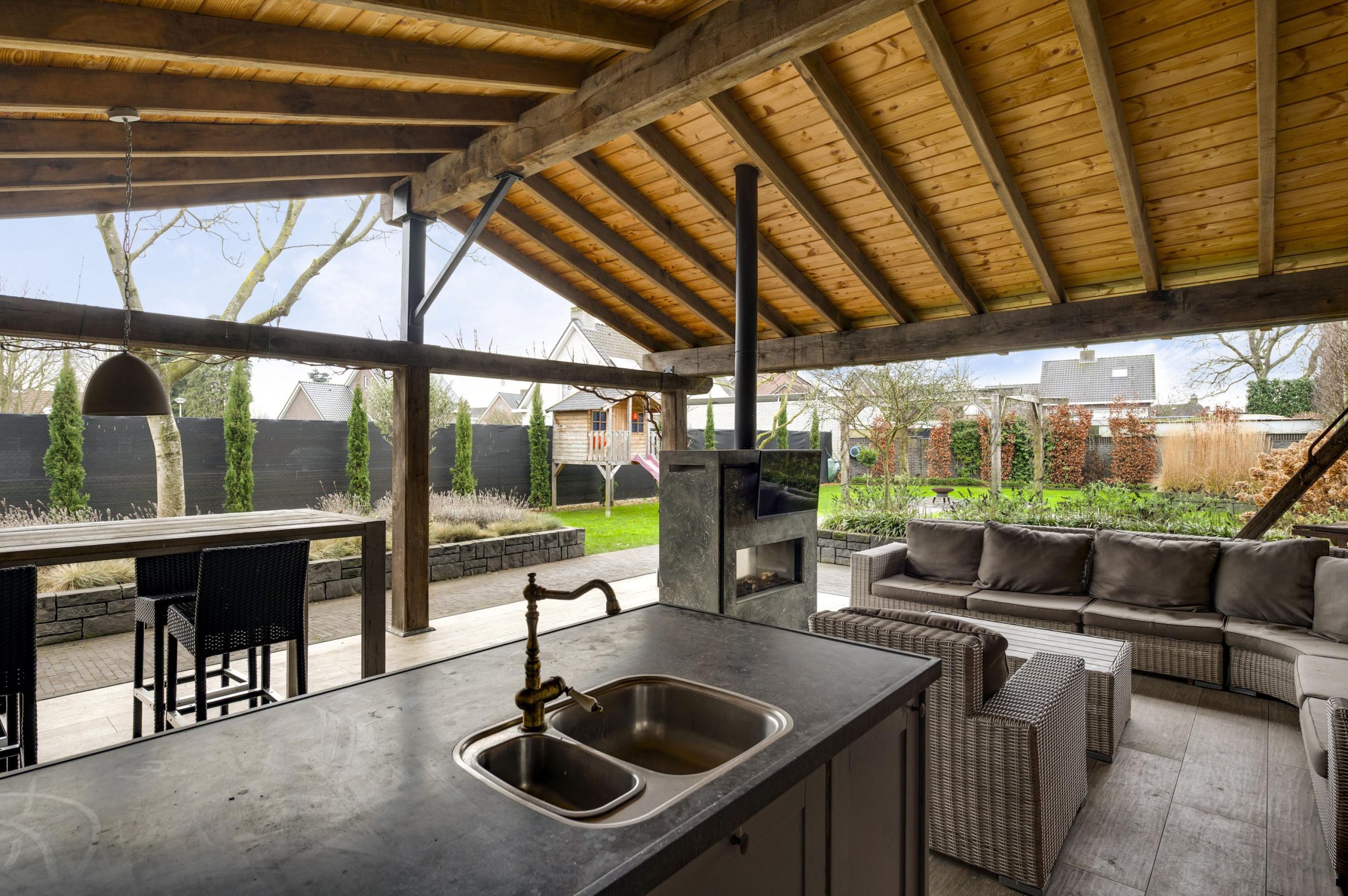De achtertuin is een absolute eyecatcher. Hier geniet u van optimale privacy, een verzorgd gazon, volwassen beplanting en een prachtige eikenhouten overkapping van circa 7 x 7 meter. Deze is voorzien van een complete buitenkeuken en een sfeervolle gashaard, waardoor u het hele jaar door comfortabel buiten kunt zitten. Dankzij de grondwaterpomp en beregeningsinstallatie blijft de tuin bovendien eenvoudig in topconditie.