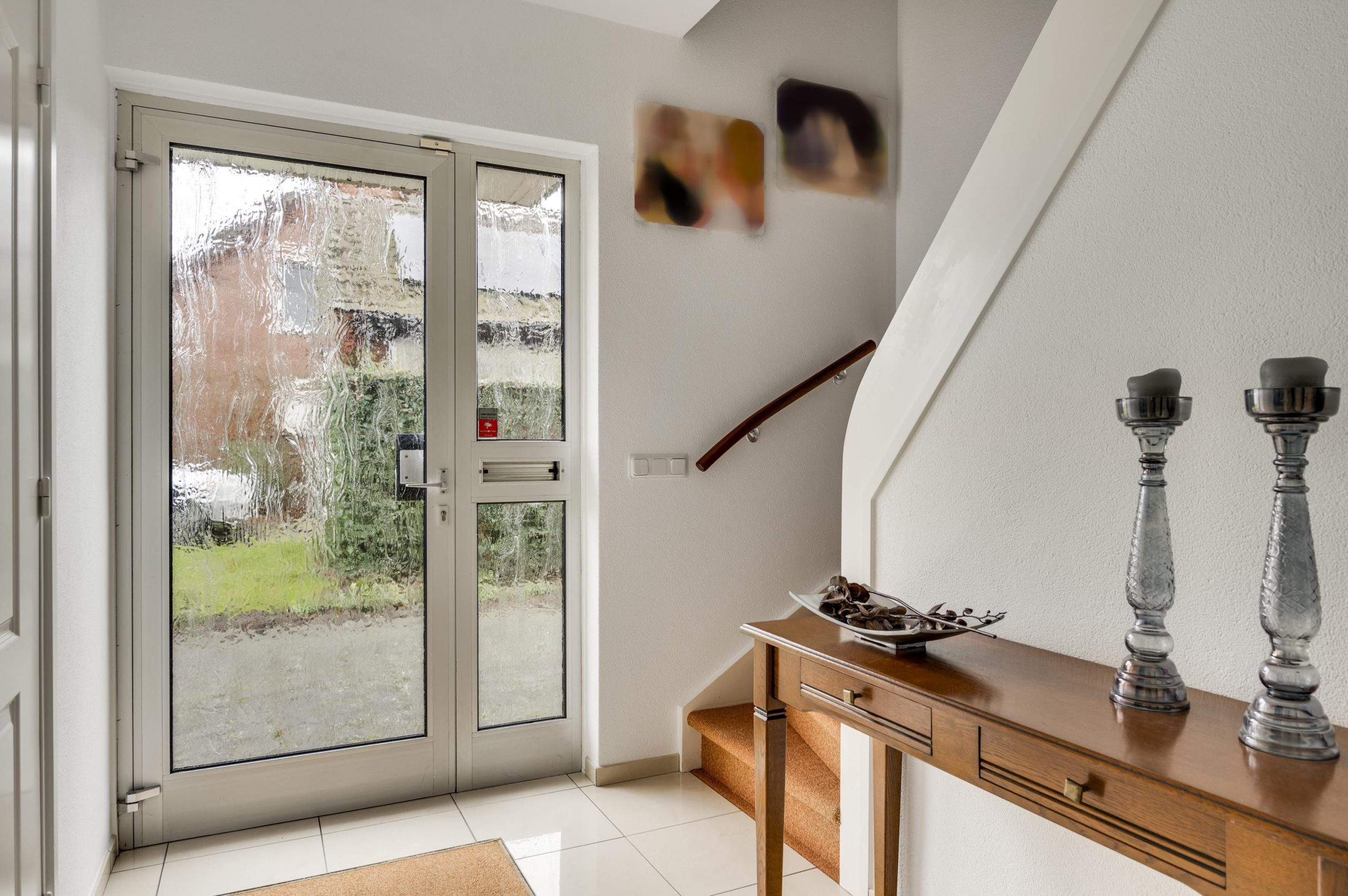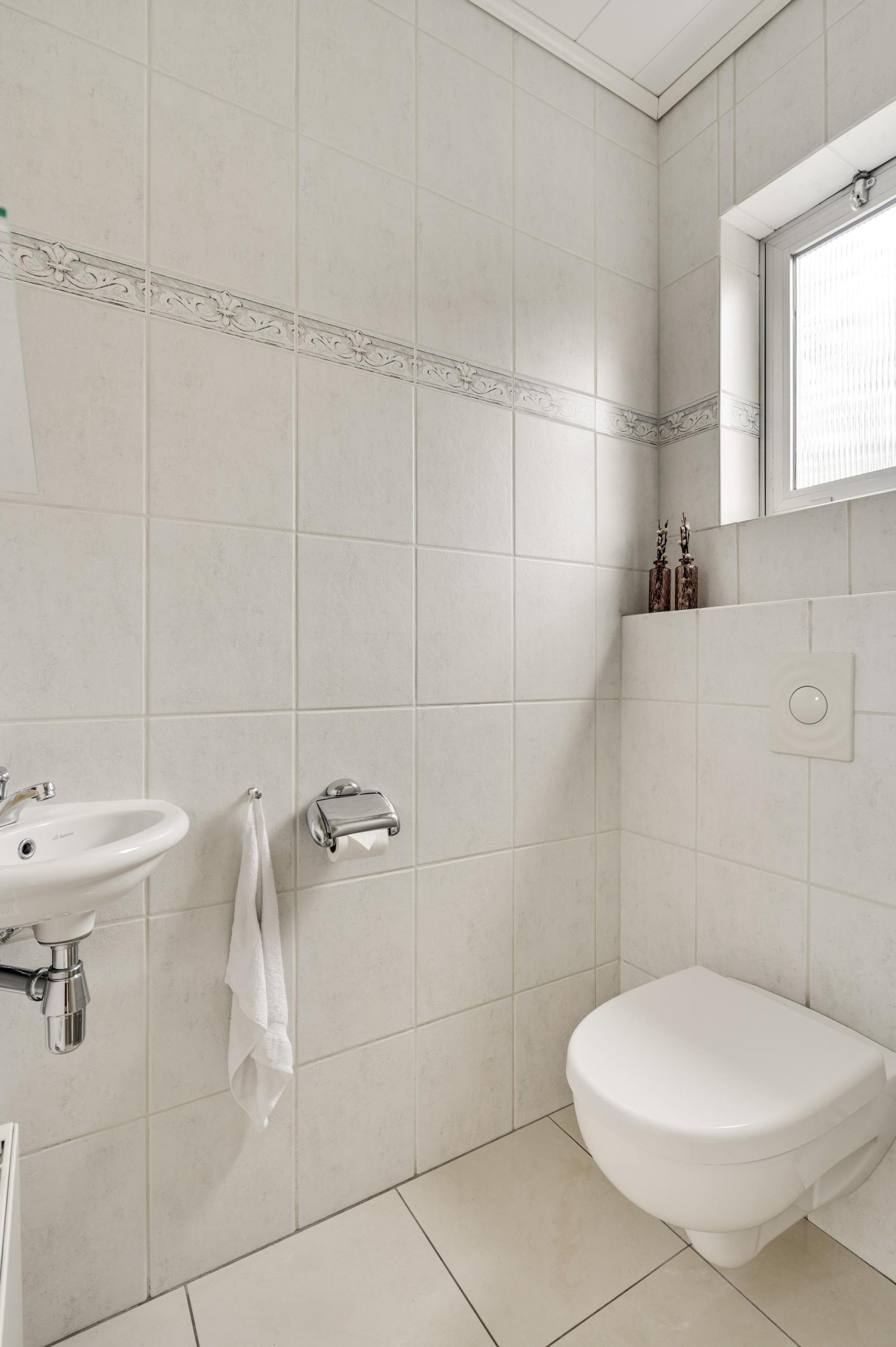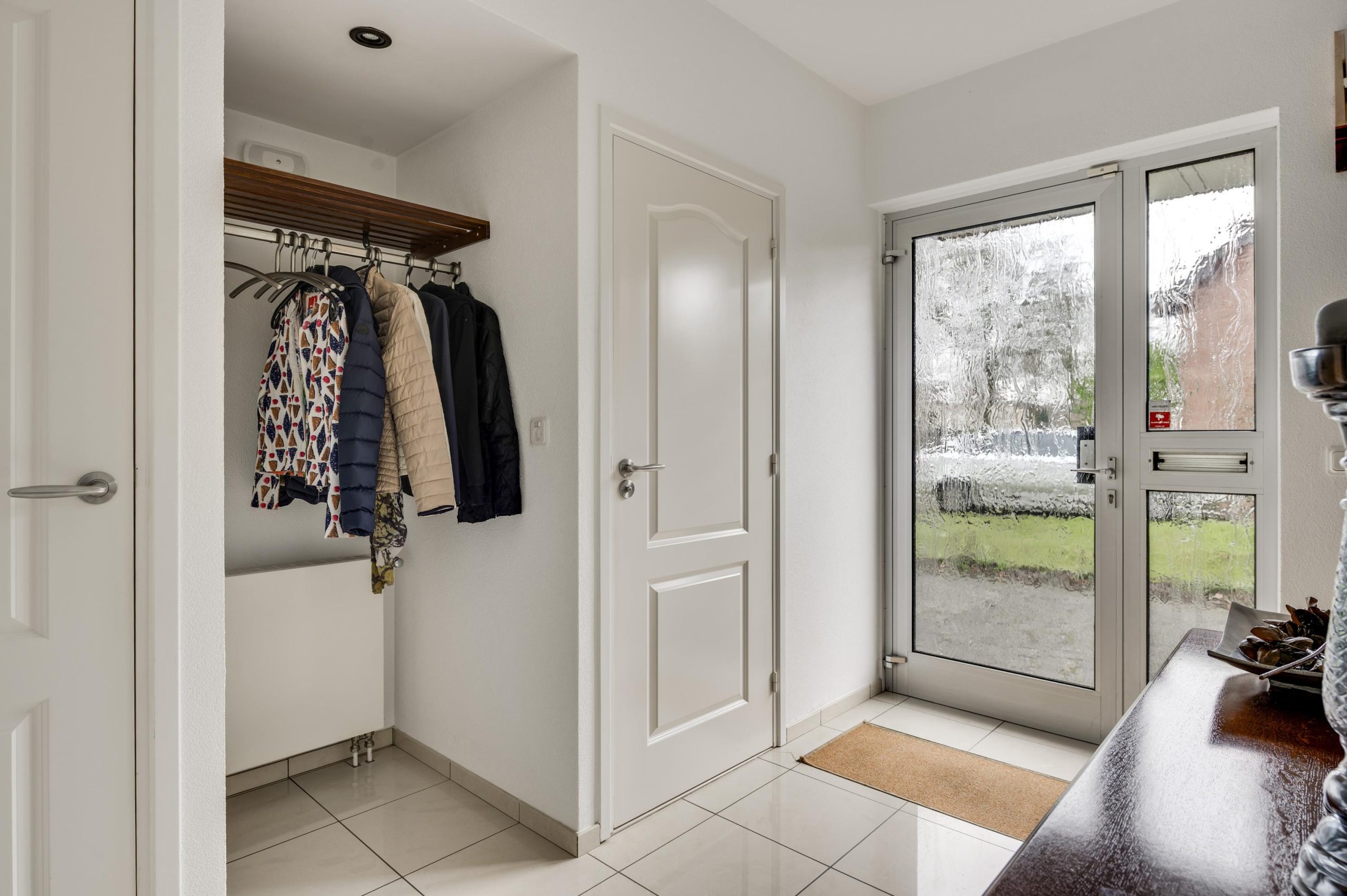 Via de royale oprit bereikt u de entree in de zijgevel van de woning. De ontvangsthal biedt toegang tot de meterkast, garderobe en de geheel betegelde toiletruimte met hangend toilet en fonteintje.