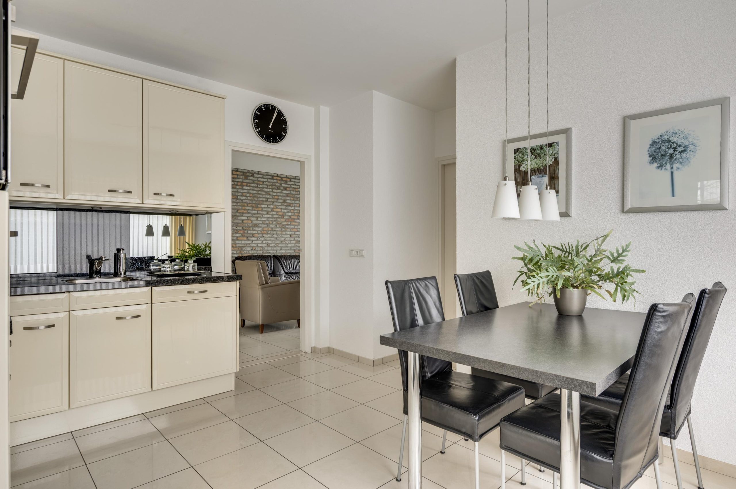 De gesloten eetkeuken is praktisch ingedeeld en voorzien van een hoekopgestelde lichte keuken (2004) met granieten werkblad en inbouwapparatuur zoals een keramische kookplaat, afzuigkap, koelkast, vaatwasser en combi oven-magnetron.