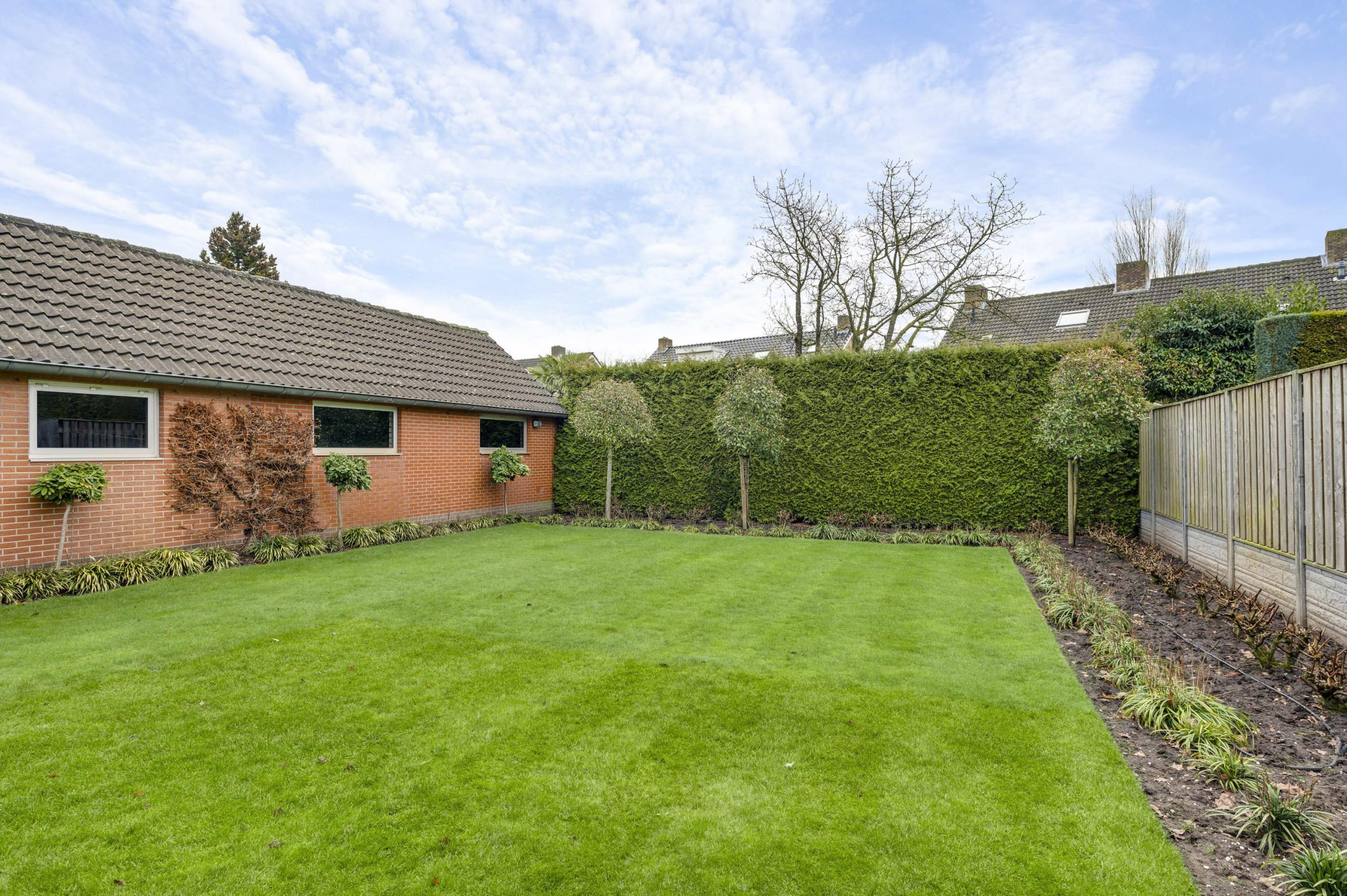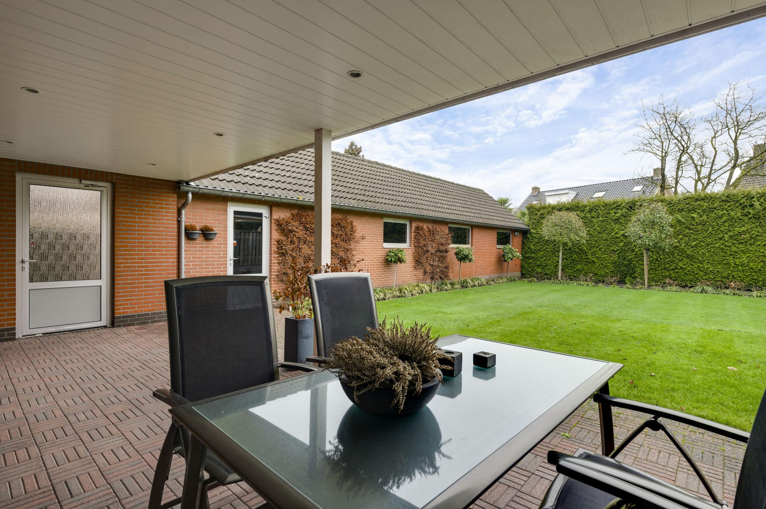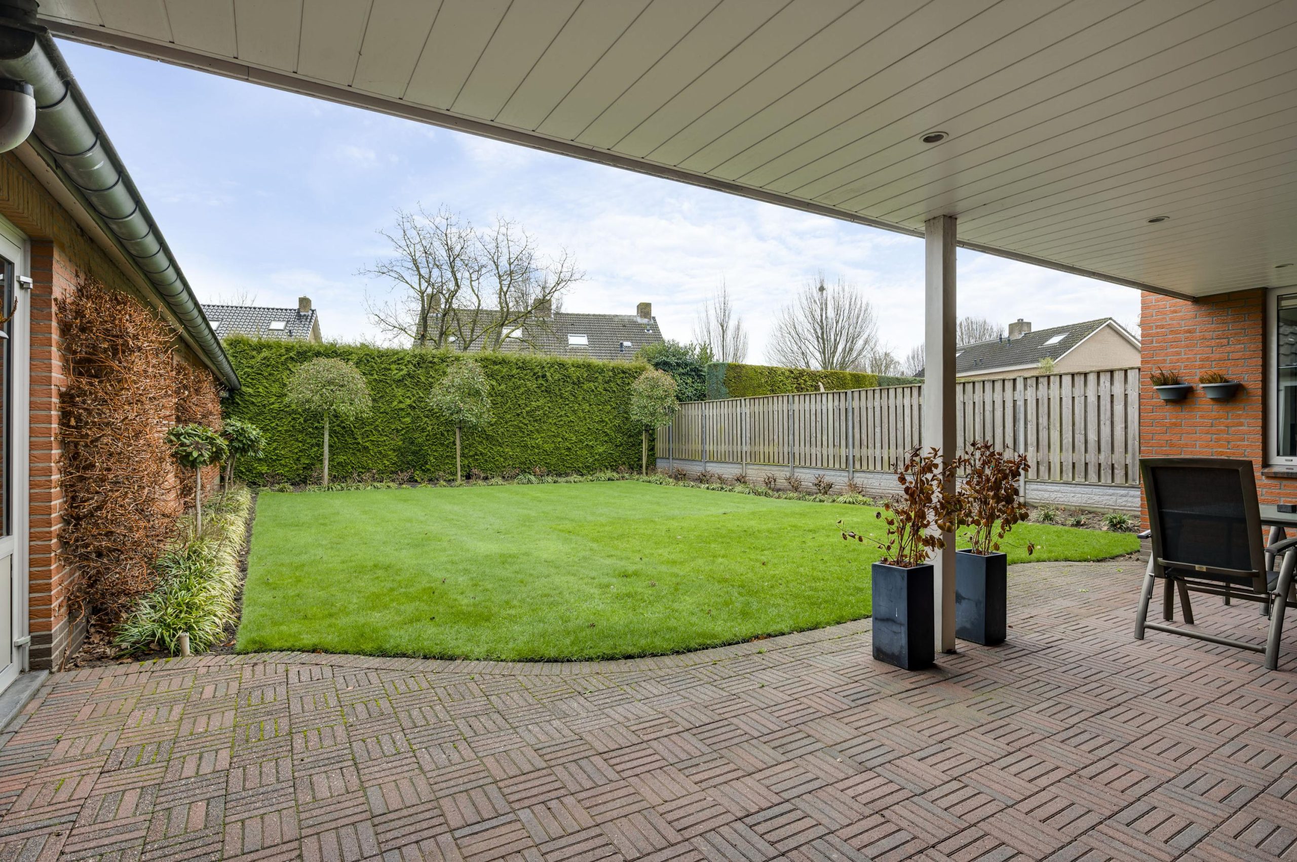 De achtertuin is gelegen op het oosten en biedt veel privacy. De tuin is ingericht met een groot gazon en een ruim terras onder de overkapping (ca. 24m2), waardoor u hier al vroeg in het seizoen en tot laat in de avond comfortabel buiten kunt zitten.